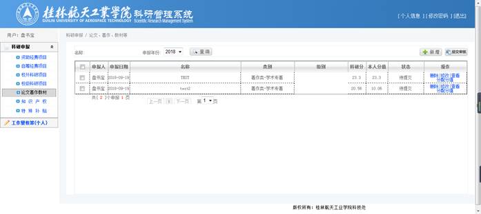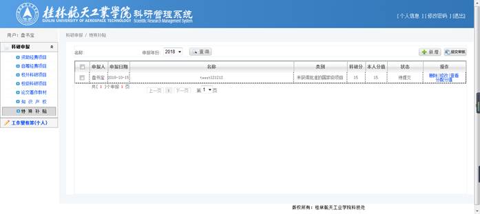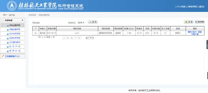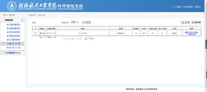 点击列表中【删除】,删除该申报资料;点击列表中【修改】,进行修改页面;点击列表中【查看】进入查看申报信息页面;点击列表中【分配分值】进入分值分配页面;