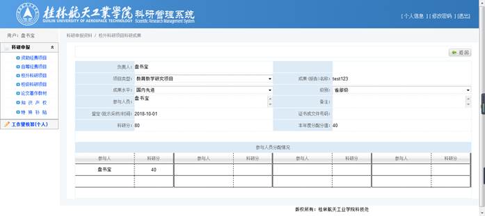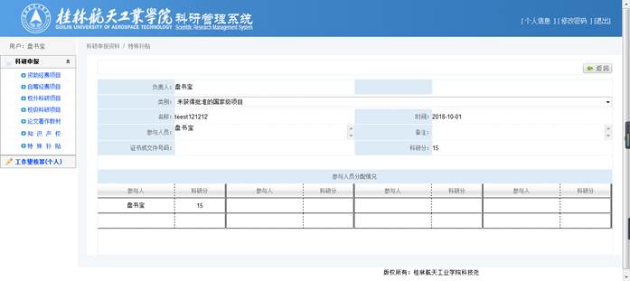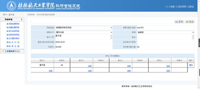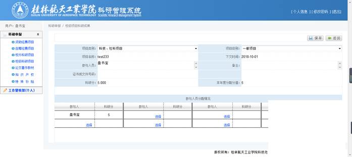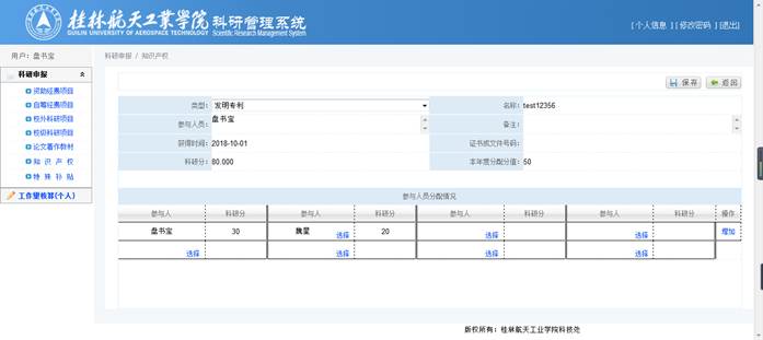 录入【类别】、【名称】、【参与人员】(方便审核)后,将自动计算出【科研分】,确认【科研分】无误后,再在参与人员分配情况中选择具体成员并分配分值,点击【保存】完成修改操作。
