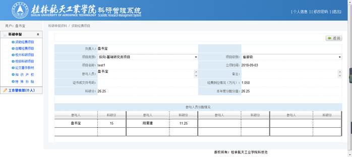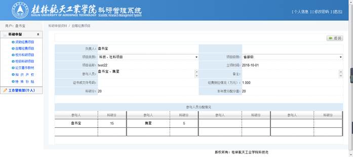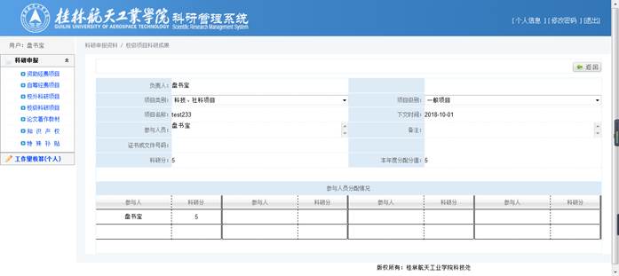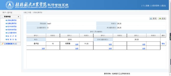 录入【项目类别】、【项目级别】、【项目名称】、【立项时间】、【参与人员】(方便审核)、【经费到位情况】(注意单位是万元,且此处只能录入数字和小数点)后,将自动计算出【科研分】,确认【科研分】无误后,录入【本年度分配分值】,再在参与人员分配情况中选择具体成员并分配分值,点击【保存】完成修改操作。