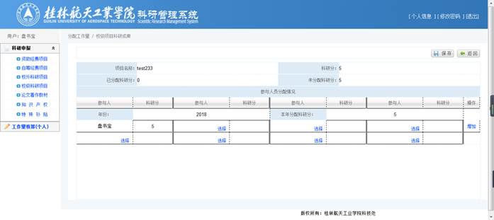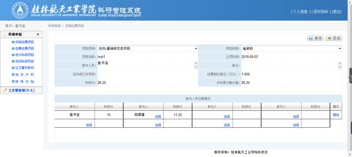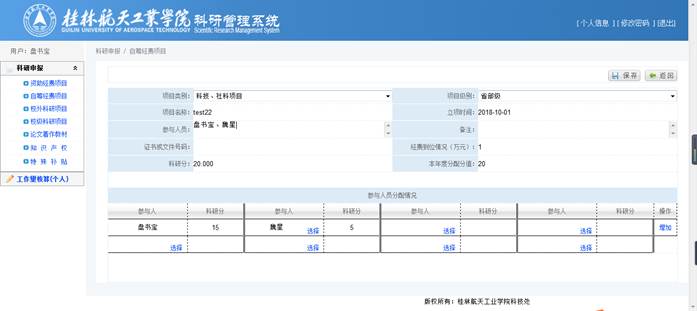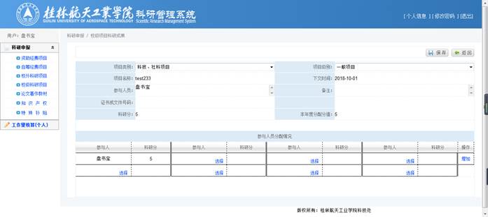 录入【项目类别】、【项目级别】、【项目名称】、【立项时间】、【参与人员】(方便审核)、【经费到位情况】(注意单位是万元,且此处只能录入数字和小数点)后,将自动计算出【科研分】,确认【科研分】无误后,录入【本年度分配分值】,再在参与人员分配情况中选择具体成员并分配分值,点击【保存】完成新增操作。