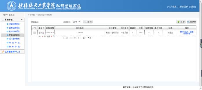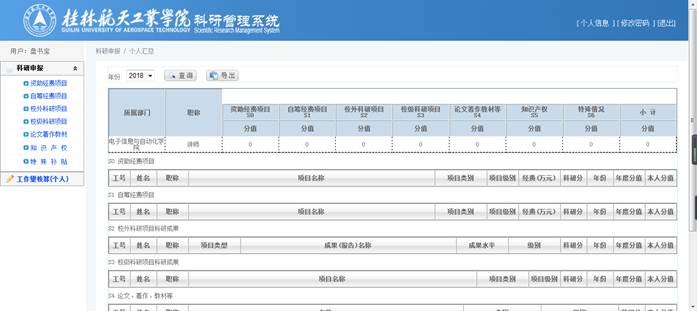 主页面左边为操作栏菜单,点击菜单进行申报和个人工作量核算页面;