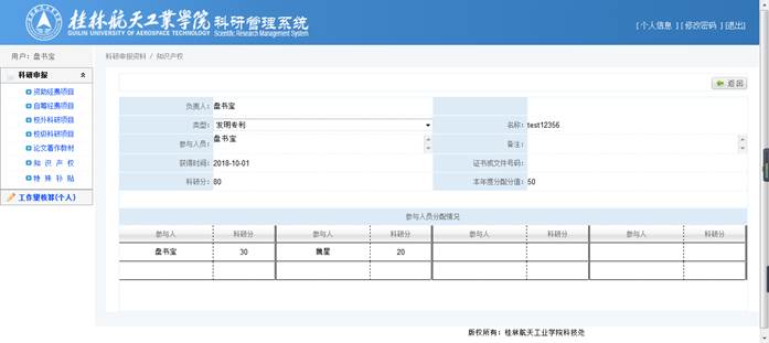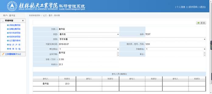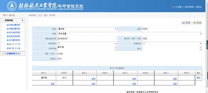 录入【类型】、【名称】、【期刊号、卷号、页面】、【单位排名】、【作者排名】、【全体作者】(方便审核)后,将自动计算出【科研分】,确认【科研分】无误后,再在参与人员分配情况中选择具体成员并分配分值,点击【保存】完成修改操作。