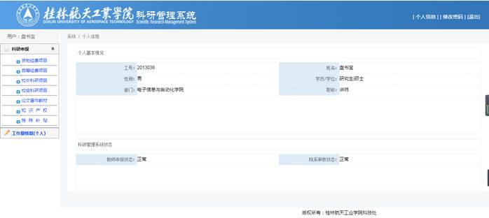 主页面右边为用户的个人基本情况和科研管理系统的当前状态,如发现个人基本情况有误,请联系系部管理员或学校管理员进行修改;当【教师申报状态】是暂停申报时,将不能再提交申报资料。
