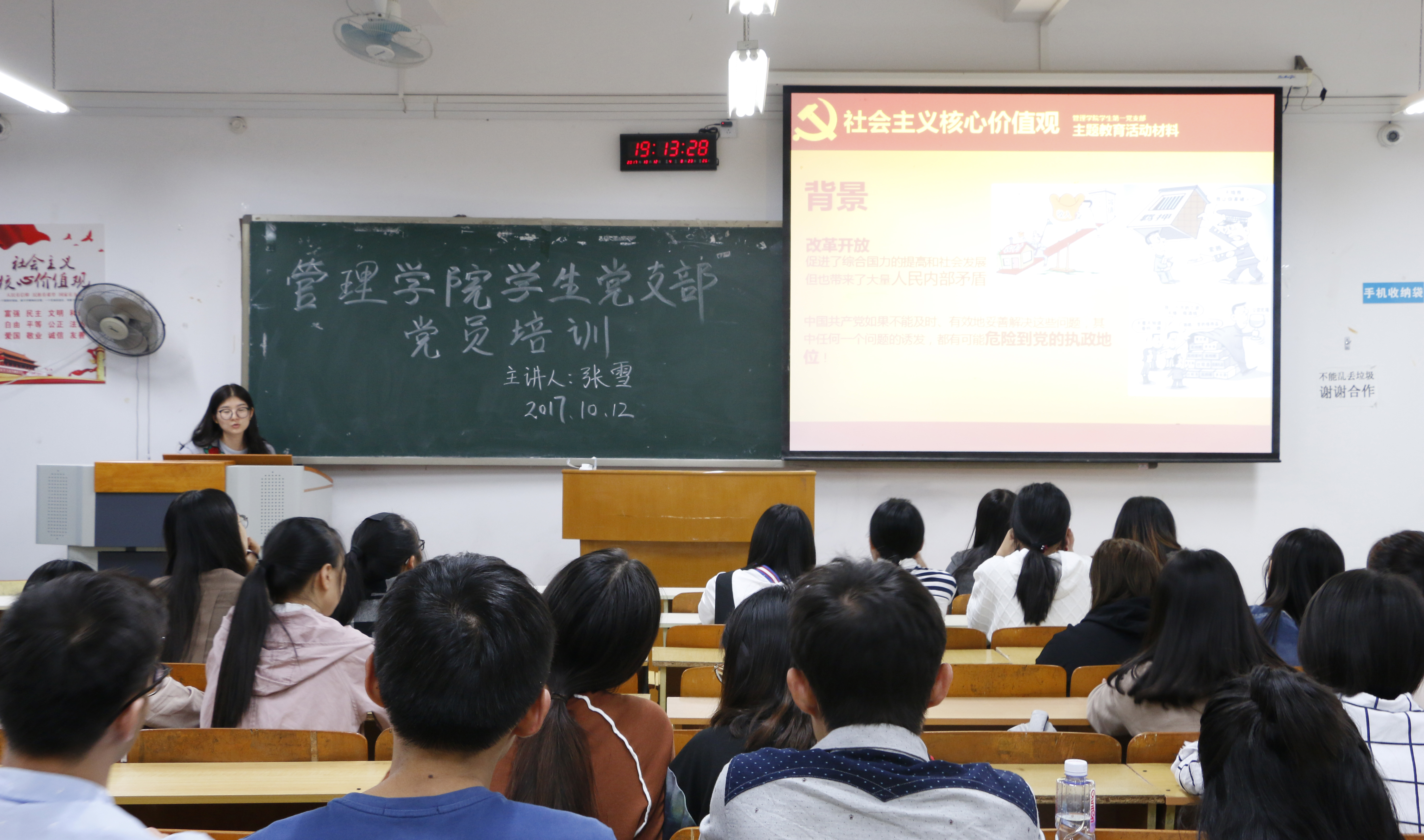 2017年10月12日晚上19:00,支部在明志楼308室开展了以“社会主义核心价值观”为主题的党员培训活动。本次培训主要包括对社会主义核心价值观的解读、对中国梦的解读、社会主义核心价值观与中国梦的关系及当代大学生如何践行社会主义核心价值观四个方面的内容,通过开展“社会主义核心价值观”的党课学习,为学生党员们详细解读了社会主义核心价值观的内涵,正确引导学生党员树立自己的价值观,充分理解社会主义核心价值观与中国梦的关系,自觉将社会主义核心价值观践行到学习生活当中去。
