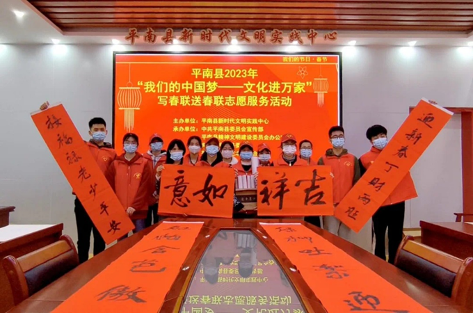 人气与节日总能碰撞出热烈的火花,我参加平南县开展的2023我们的中国梦文化进万家写春联送春联志愿服务活动,在中国传统春节这个喜庆的节日里把春联送到村民的手中,与村民一起感受春节的氛围、享受春节的快乐 ,此次活动弘扬了中华传统文化,增加了节日气氛,提高了我对练书法的积极性,同时也加强了我与村民之间的交流互动。