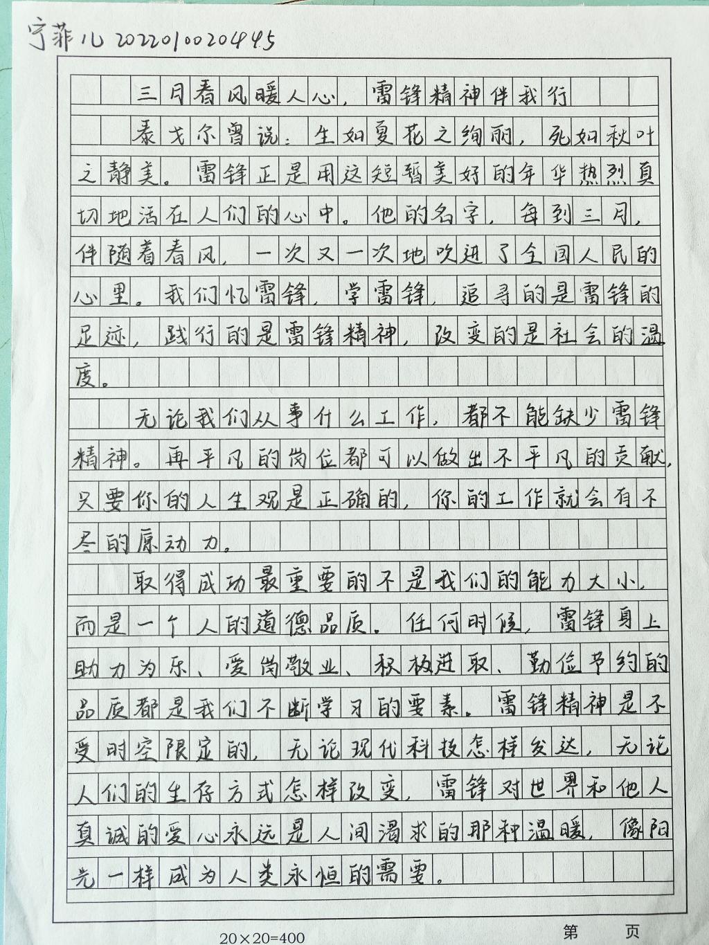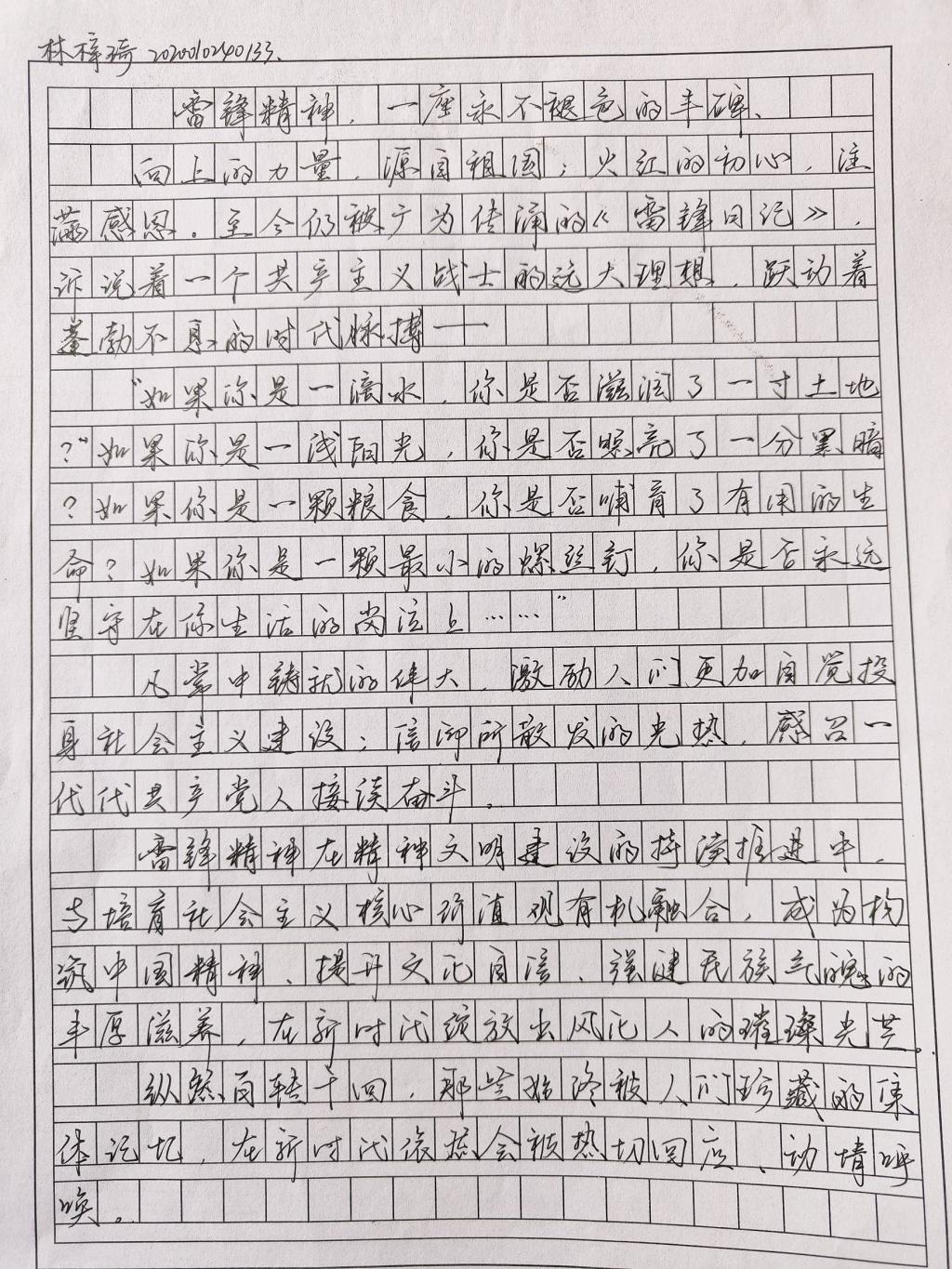 几十年来,以为人民服务为核心的“雷锋精神”,影响了一代又一代中国人。“人的生命是有限的,可是,为人民服务是无限的,我要把有限的生命投入到无限的为人民服务上去......”这是雷锋同志著名的一句话。品雷锋笔记,犹如与雷锋同志进行一次交流。参与此次活动的桂航学子右手握着笔,左手撑着纸,眼睛时而看看《雷锋日记》范本,时而在稿纸上一字一划的书写着。时间在同学们沙沙的写字声中过去,当写完所有的内容,他们郑重的在稿纸最后留下自己的名字,为参与这次抄写《雷锋日记》活动划下句号。接下来我们一起欣赏活动的部分优秀作品。