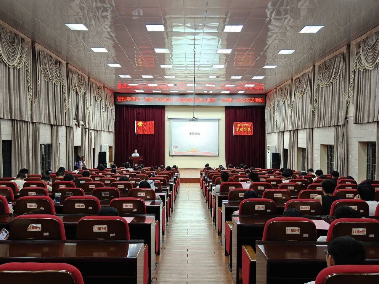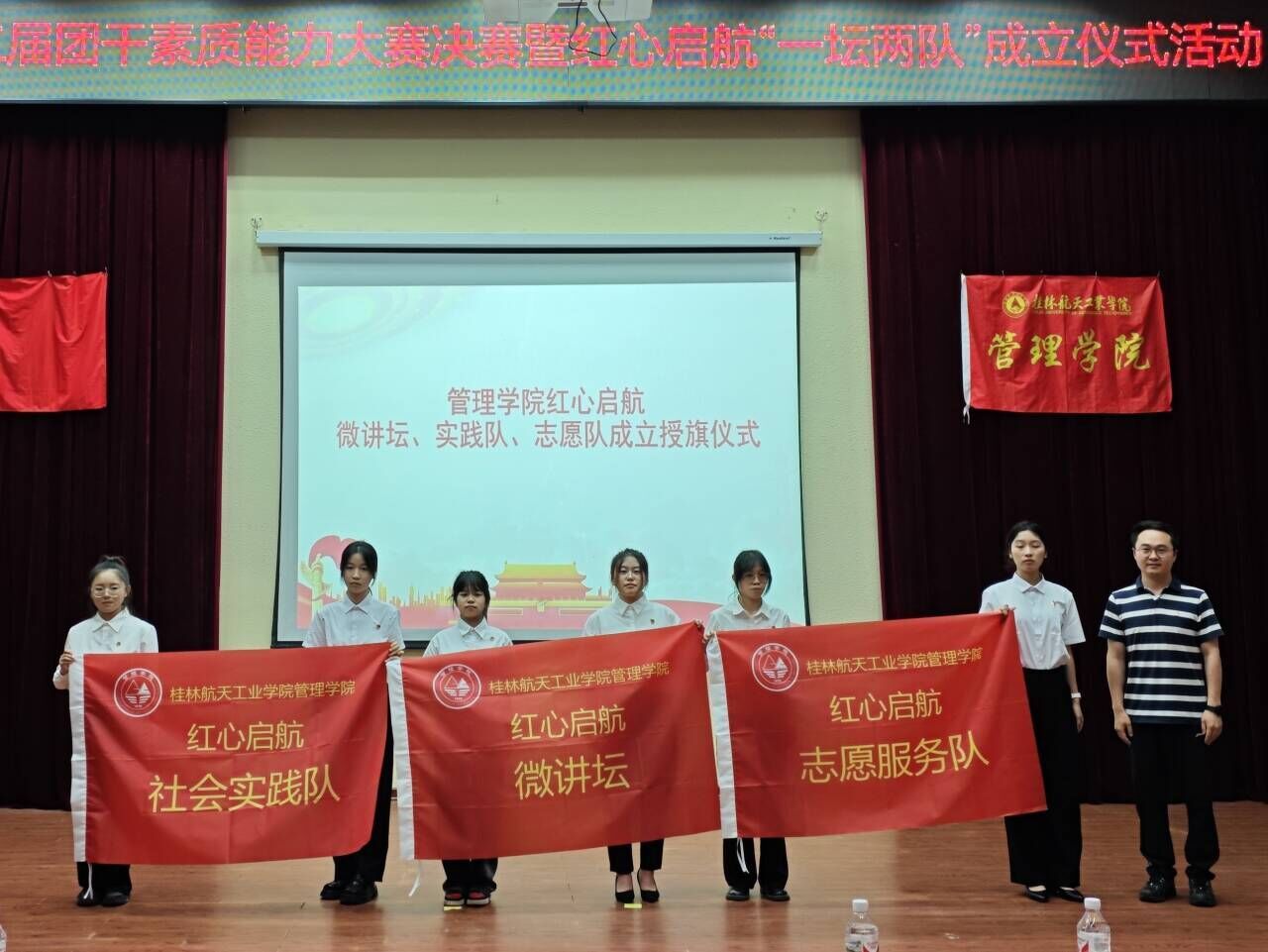 随后,杭盖老师为我院“红心启航-微讲坛、实践队、志愿队”授旗,队员代表接过队旗,标志着我院“一坛两队”正式肩负起新的使命和担当,“一坛两队”的成立旨在为管院学子们提供一个能够展示自我、锻炼能力的平台。