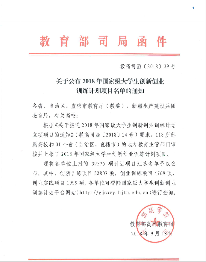 关于公布2018年国家级大学生创新创业训练计划项目名单的通知