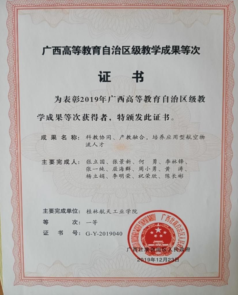 为凸显育人特色,开展航空物流人才培养专业模式研究与实践,获全国教育科学规划课题1项等12项省部级教改项目,获广西教学成果一等奖4项,二等奖1项。