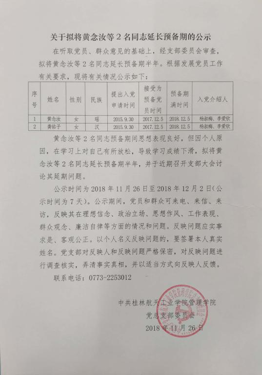 关于拟将黄念汝等2名同志延长预备期的公示