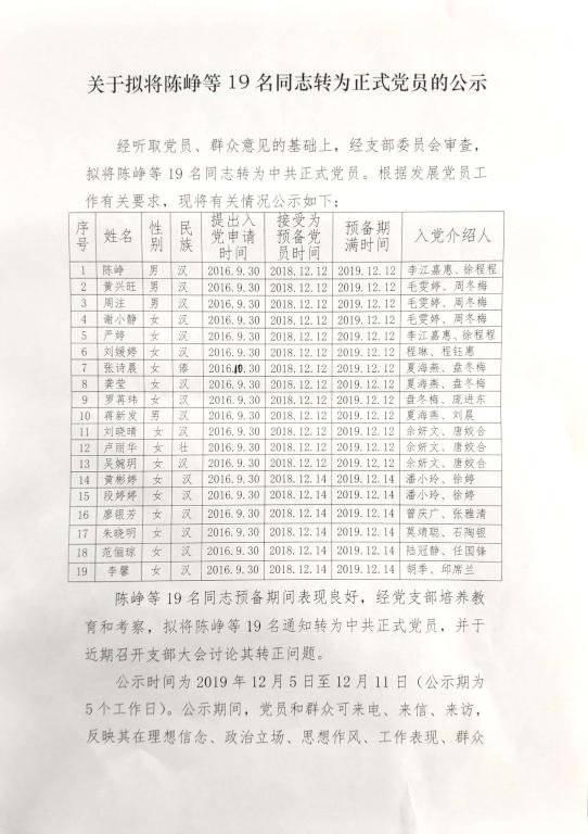 关于拟将陈峥等19名同志转为正式党员的公示