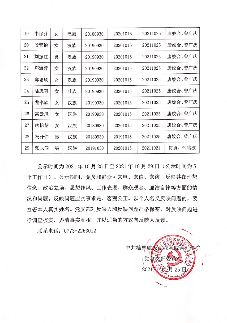 关于拟将韦黄钦妤等29名同志转为正式党员的公示