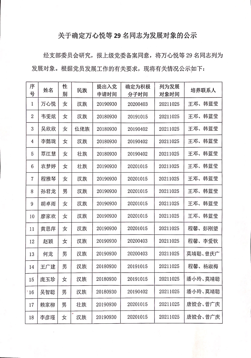 关于确定万心悦等29名同志为发展对象的公示