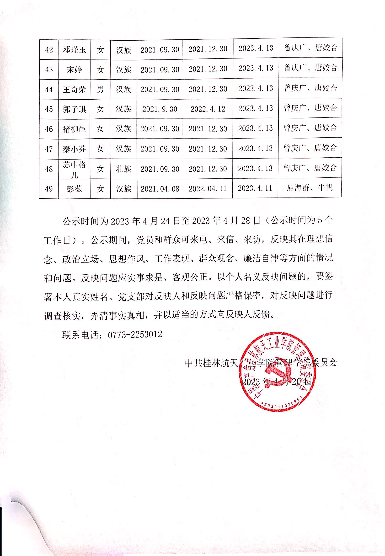 关于将彭婧婧等49名同志列为发展对象的公示