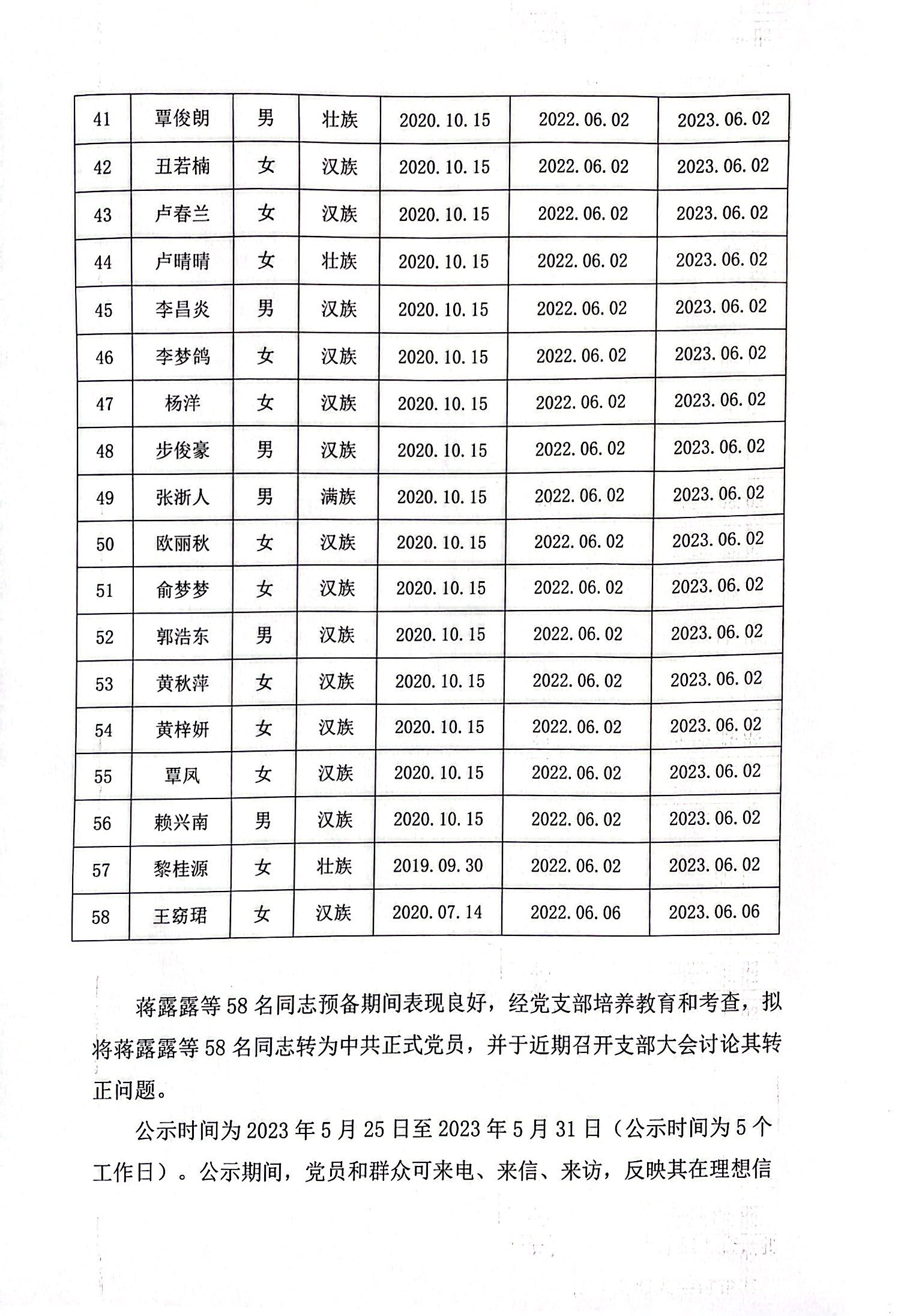 关于拟将蒋露露等58名同志转为正式党员的公示