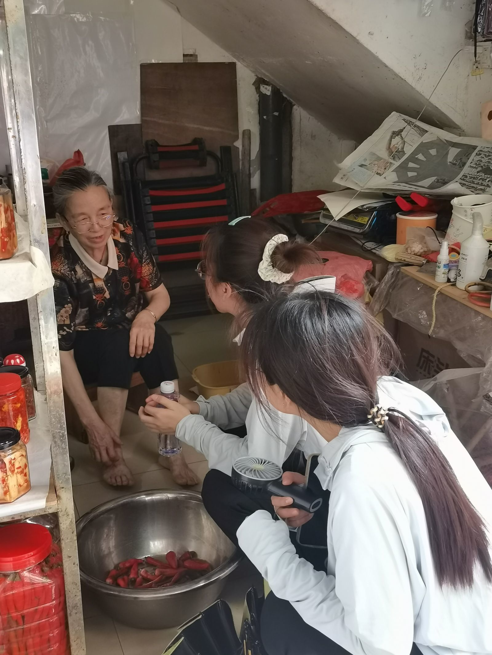 图为团队成员走访纯手工制作各种各样辣椒酱制作地的图片 通讯员陆雨 摄