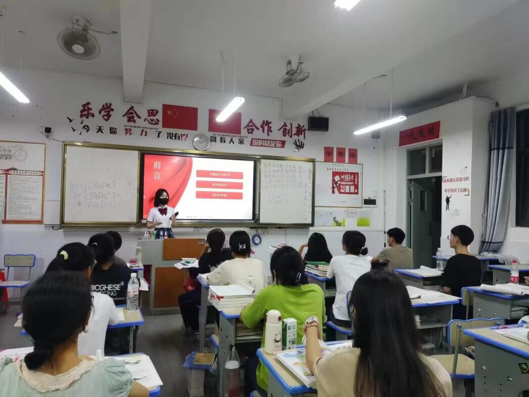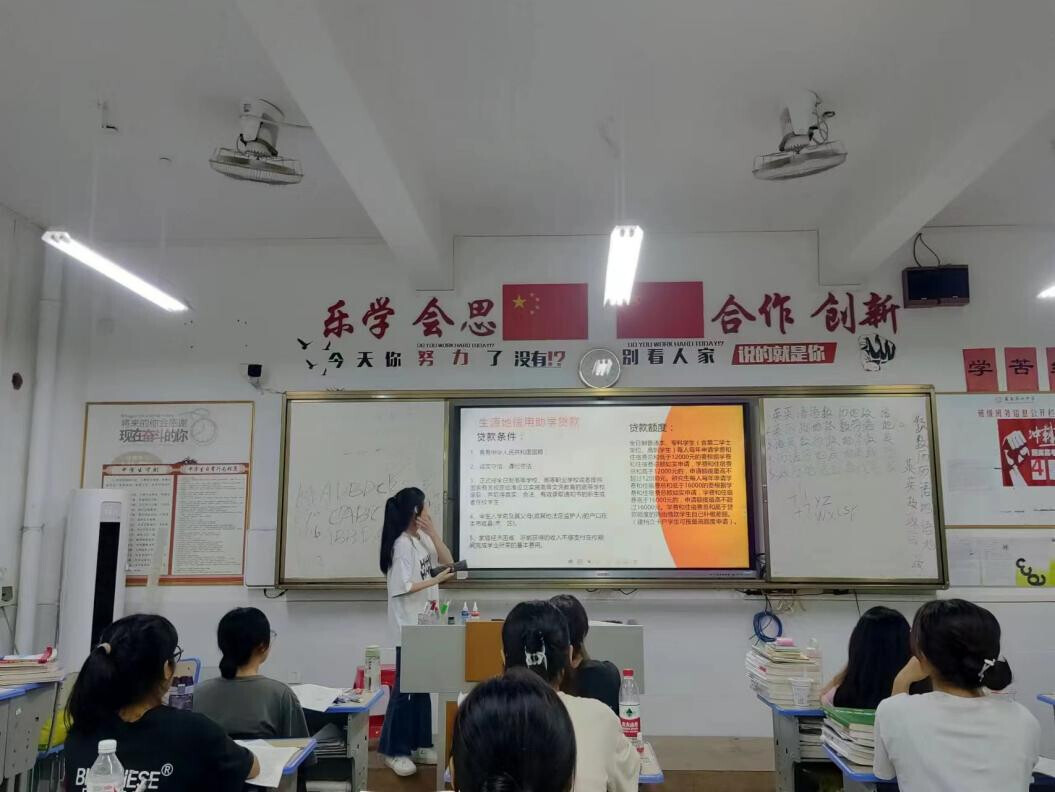 图为实践队员在母校为学弟学妹们讲解国家资助政策。(黄嘉慧 摄)
