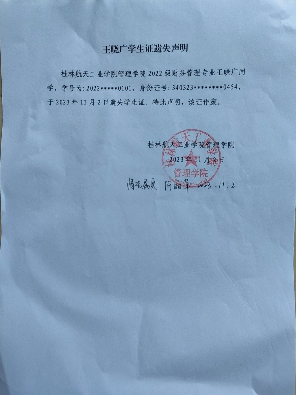 王晓广学生证遗失声明