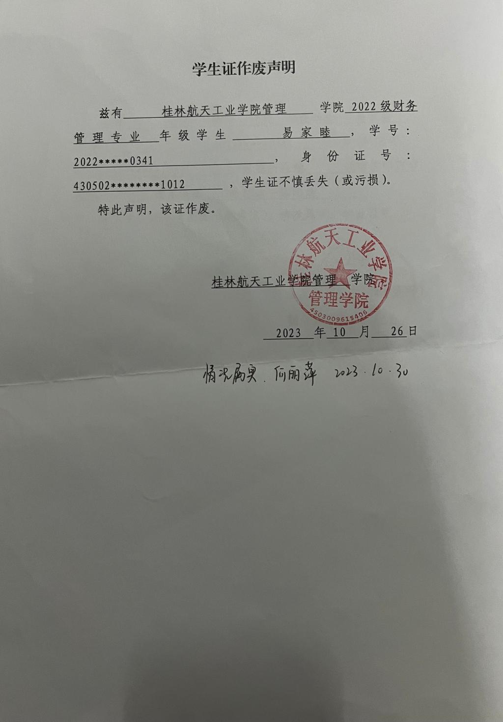 易家睦学生证作废声明