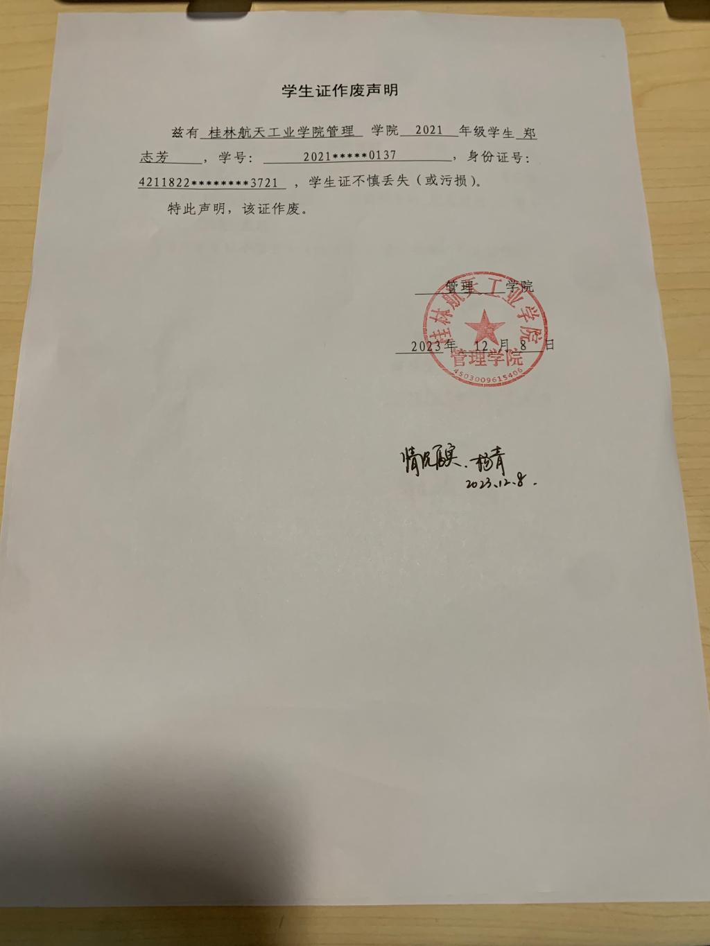 郑志芳学生证作废声明