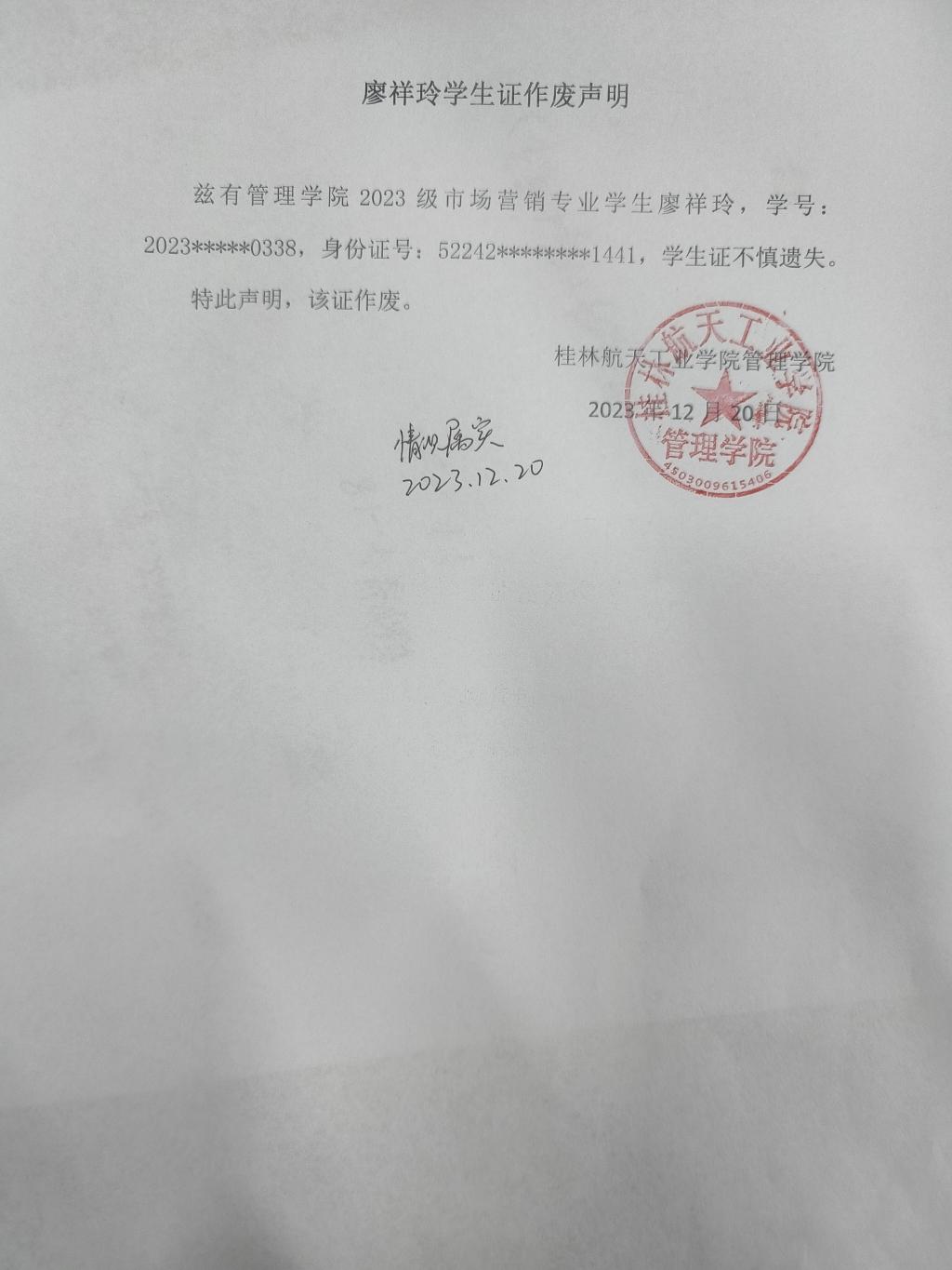 廖祥玲学生证作废声明