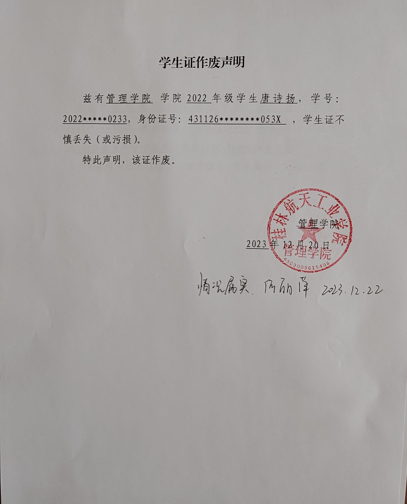 唐诗扬学生证作废声明