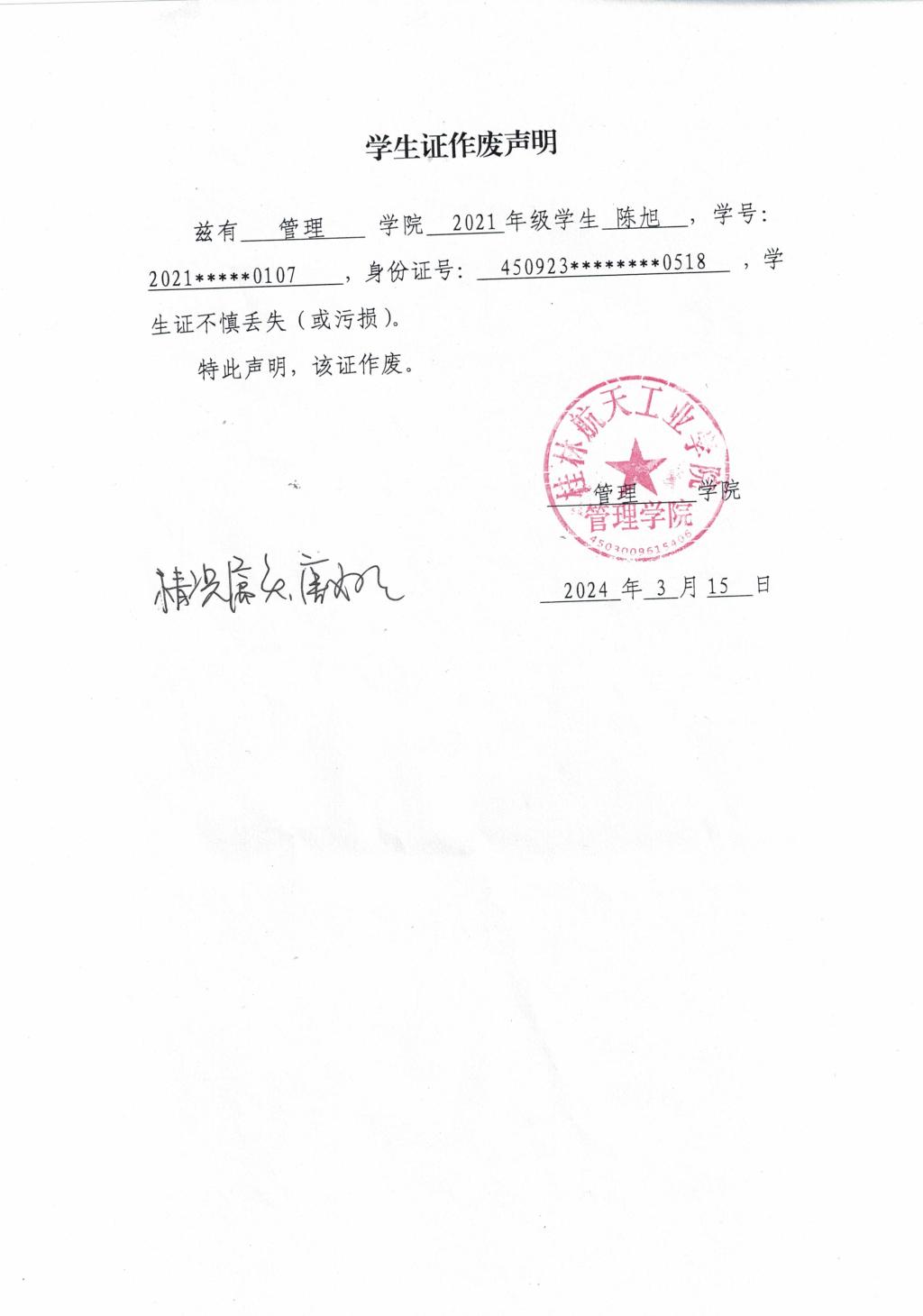 陈旭学生证作废声明