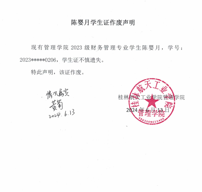 陈婴月学生证作废声明