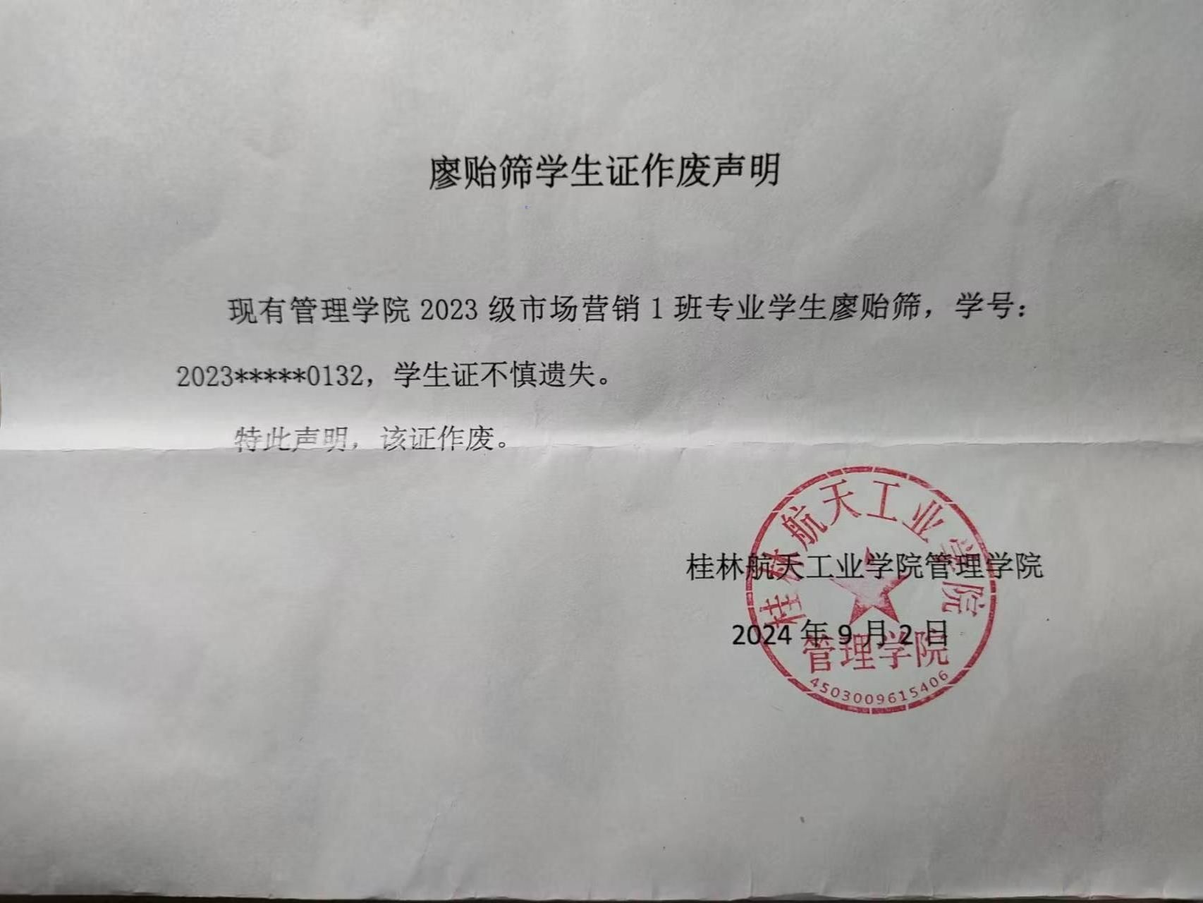 廖贻筛学生证作废声明