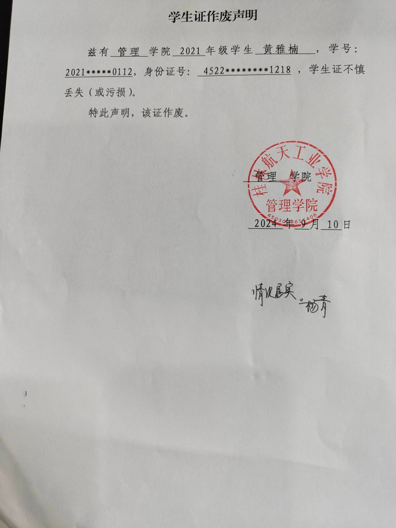黄雅楠学生证作废声明