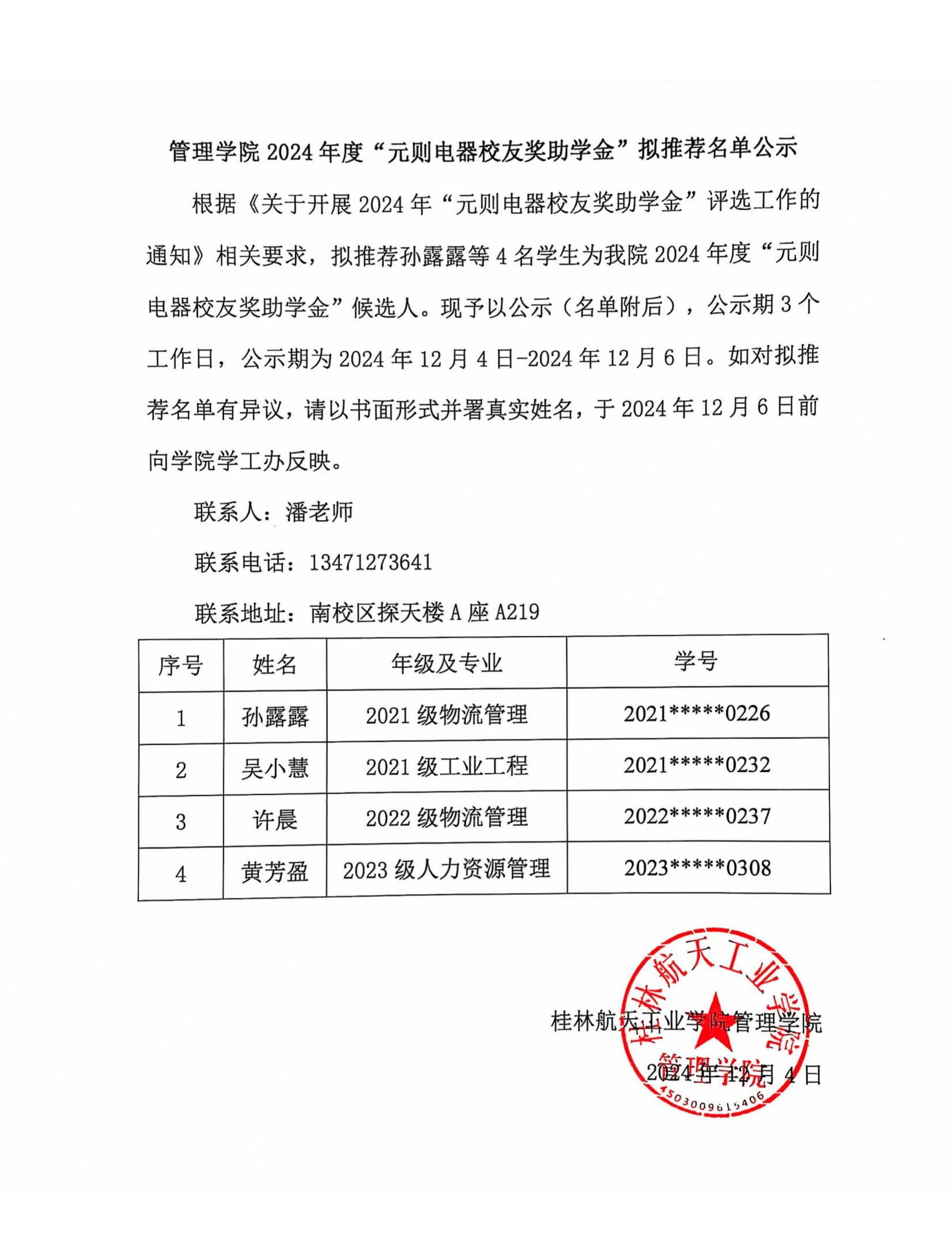 根据《关于开展2024年“元则电器校友奖助学金”评选工作的通知》相关要求,拟推荐孙露露等4名学生为我院2024年度“元则电器校友奖助学金”候选人。现予以公示(名单附后),公示期3个工作日,公示期为2024年12月4日-2024年12月6日。如对拟推荐名单有异议,请以书面形式并署真实姓名,于2024年12月6日前向学院学工办反映。
