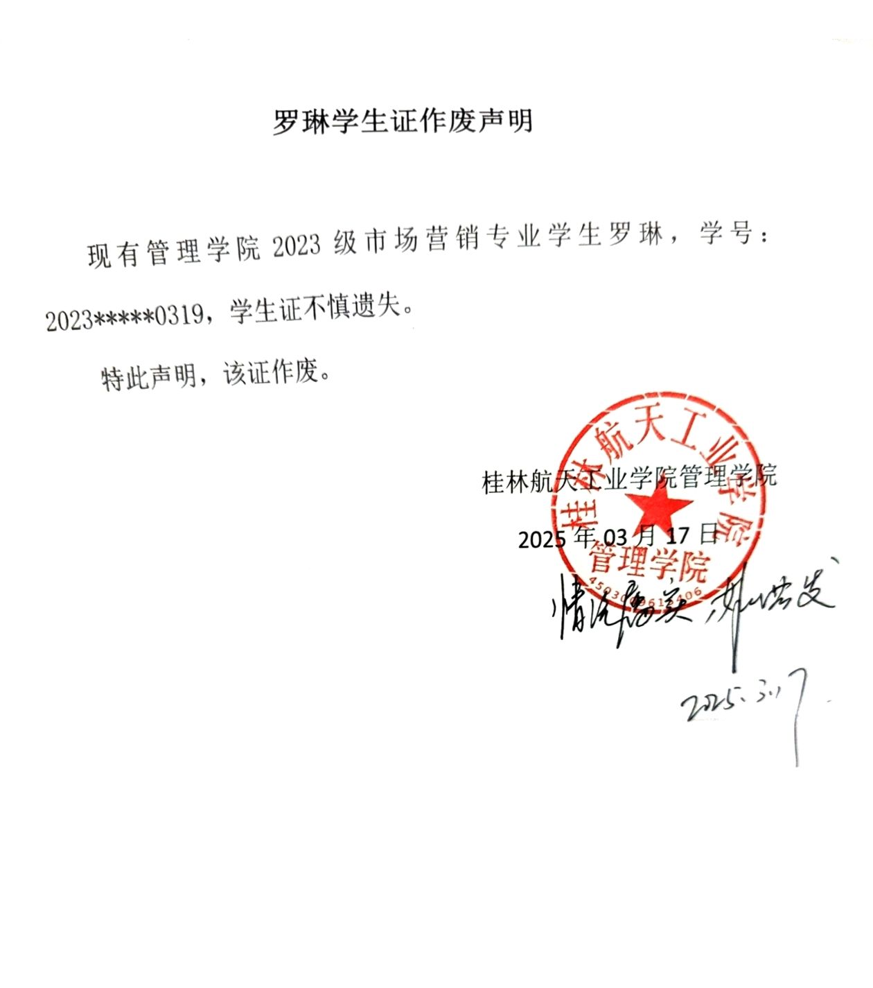 罗琳学生证作废声明