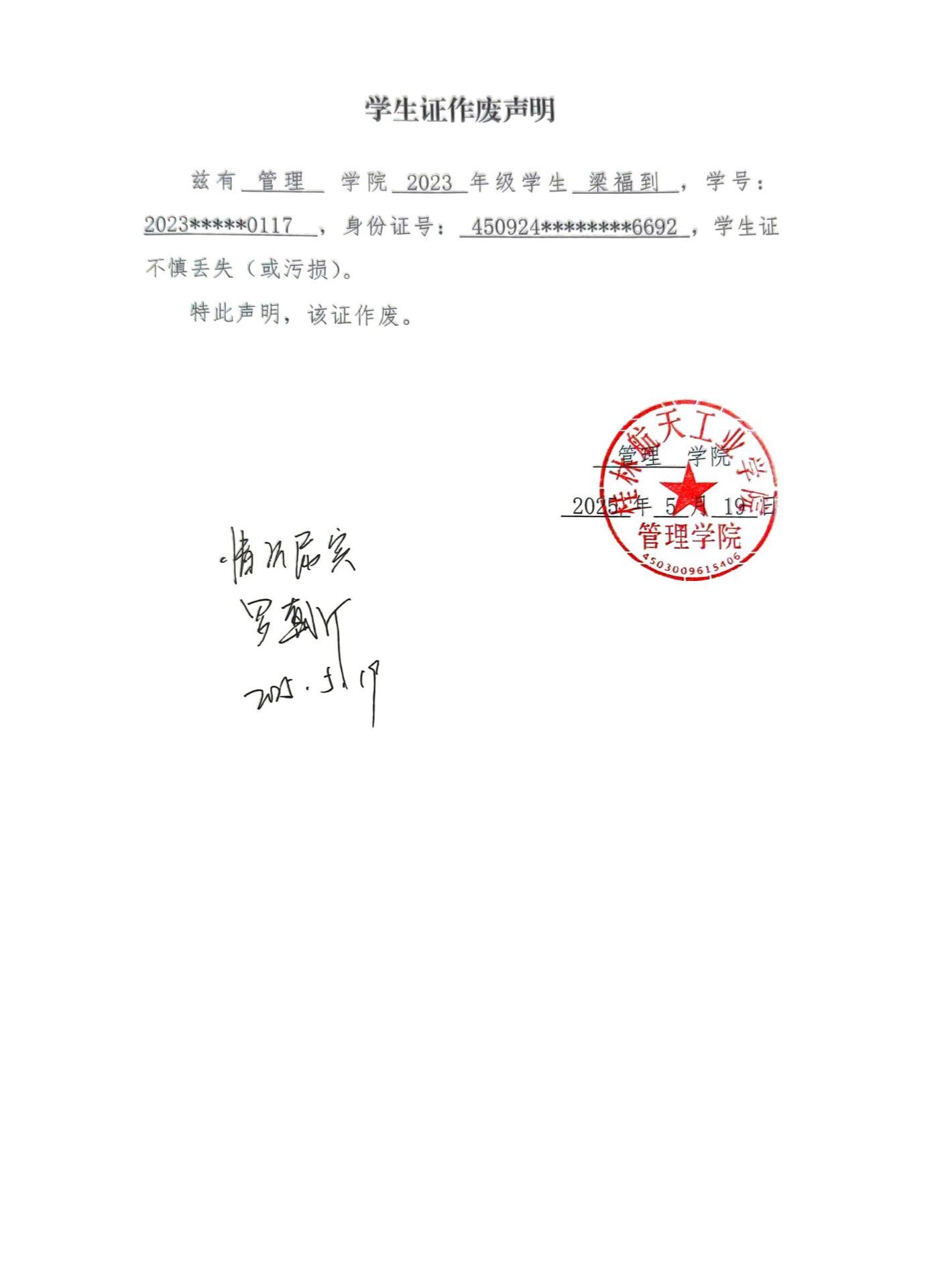 梁福到学生证作废声明