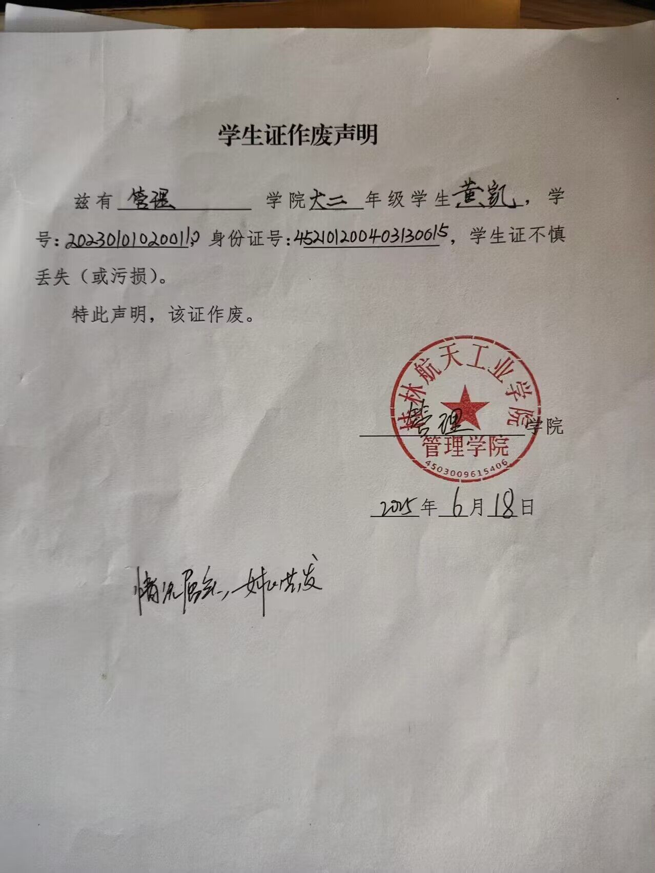 黄凯学生证作废声明