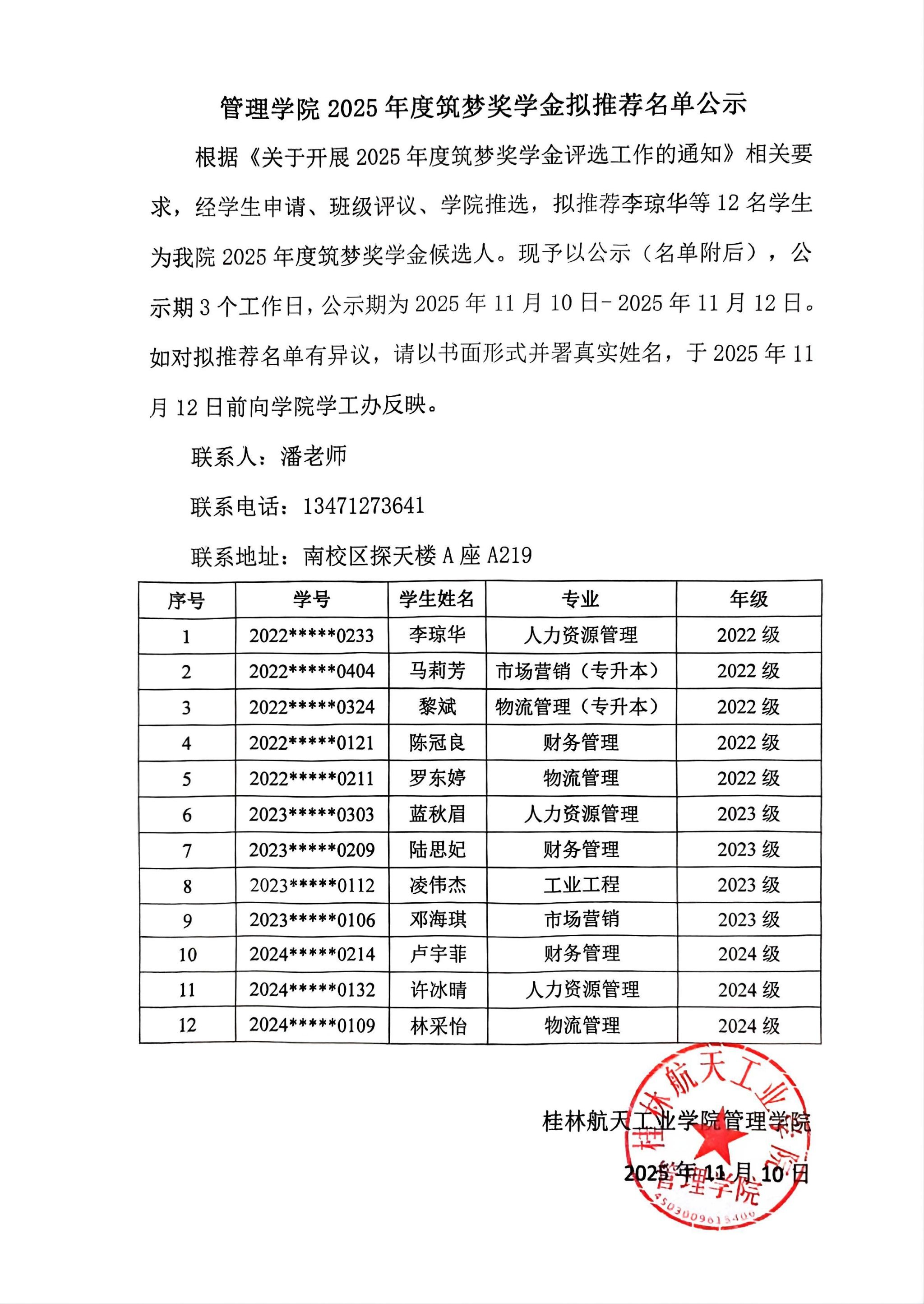 根据《关于开展2025年度筑梦奖学金评选工作的通知》相关要求,经学生申请、班级评议、学院推选,拟推荐李琼华等12名学生为我院2025年度筑梦奖学金候选人。现予以公示(名单附后),公示期3个工作日,公示期为2025年11月10日- 2025年11月12日。如对拟推荐名单有异议,请以书面形式并署真实姓名,于2025年11月12日前向学院学工办反映。