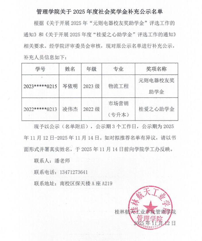 根据《关于开展2025年“元则电器校友奖助学金”评选工作的通知》和《关于开展2025年度“桂爱之心助学金”评选工作的通知》相关要求。经学院评审委员会审核,现对原公示名单进行补充公示,补充人员信息如下: