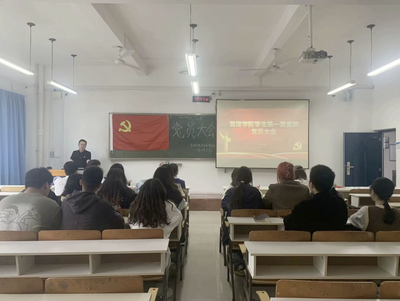 大会议程第四项:党课。杭盖同志以“学生党员如何坚定文化自信”为主题为学生党员讲授党课,通过讲解习近平文化思想的形成,让支部党员学习坚定文化自信的重要性。