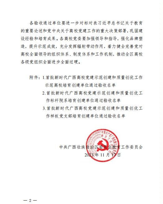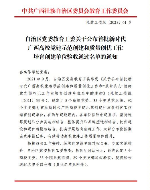 近日,自治区党委教育工委下发《关于公布首批新时代广西高校党建示范创建和质量创优工作培育创建单位验收通过名单的通知》,bevictor伟德学生第一党支部培育创建单位顺利通过验收。